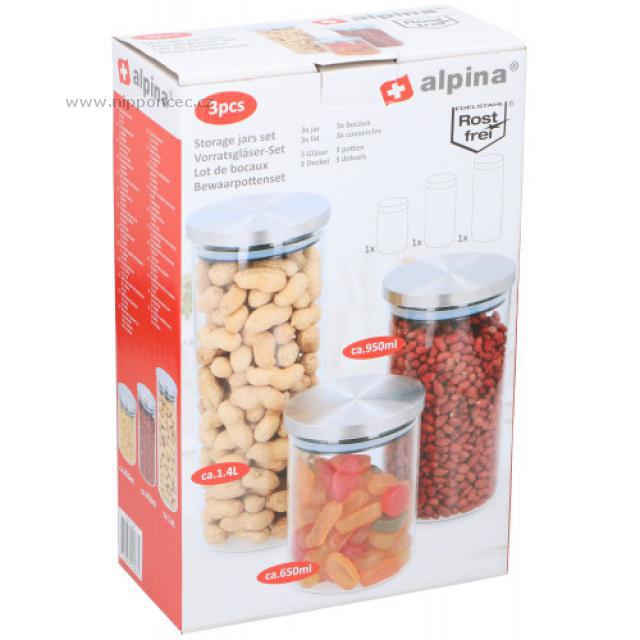 Dekorativní úložné dózy Alpina 16063 jsou ideální pro vzduchotěsné skladování potravin. Sada se skládá se ze 3 různých velikostí (1,4 l, 950 ml a 650 ml). Dózy lze mýt v myčce na nádobí. Víka nejsou vhodné do myčky. Sada skleněných dóz 3 ks Alpina 16063