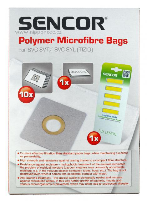 Mikrovlákenné jednorázové sáčky pro vysavač Sencor  jsou pevné a odolné. Jejich použití zajišťuje stejnoměrný sací výkon až do zcela plného sáčku. Díky hydrofobní úpravě materiálu jsou odolné proti vlhkosti a mají antibakteriální úpravu (tkanina, ze které je sáček vyroben, brání množení bakterií a plísní a průniku mikroorganismů do do ovzduší), brání vzniku alergií.