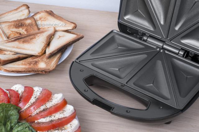 Pomocí sendvičovače Concept SV3030, který disponuje 4 trojúhelníkovými plotýnkami, připravíte až 4 sendviče najednou. Během pár minut můžete mít hotovou teplou snídani, oběd či večeři. Údržba sendvičovače je velmi jednoduchá díky nepřilnavému povrchu plotýnek. Vychladnuté plotýnky stačí otřít vlhkým hadříkem nebo papírovým ubrouskem. Po vychladnutí ho lze uložit ve svislé poloze, tudíž zabere minimum místa. Tato výhoda je velmi praktická obzvláště v malé kuchyňce. Sendvičovač je vybaven světelnou kontrolkou provozu, nahřátí a automatickou regulací teploty. Ochranou před popálením během provozu sendvičovače je držadlo, které se nezahřívá. Pro dokonalou stabilitu je vybaven protiskluzovými nožičkami.
