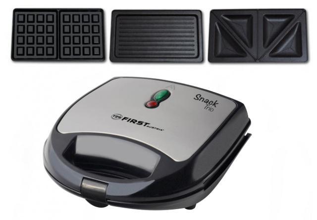 Sendvičovač, vaflovač a kontaktní gril - 3 v jednom - First - FA 5342. Šikovný menší gril 3 v jednom, který se hodí všude tam, kde je méně prostoru. Je vabaven nepřipékavými ploténky z teflonu, díky kterým se sendvičovač lépe čistí. Automatický termostatat slouží pro optimální propečení pečiva. Má dvě světelné kontrolky pro komfortní použití. Kontrolka "ready" signalizuje optimální nahřátí přístroje.