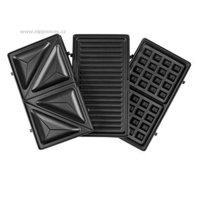 Sendvičovač, vaflovač a gril na panini - 3 v 1 - Tristar SA -3070. Je vybaven třemi typy snadno vyměnitelných desek na sendviče, vafle a panini. Desky jsou opatřeny nepřilnavým povrchem, díky kterému se sendvičovač lépe čistí. Automatický termostat slouží pro optimální propečení pečiva.