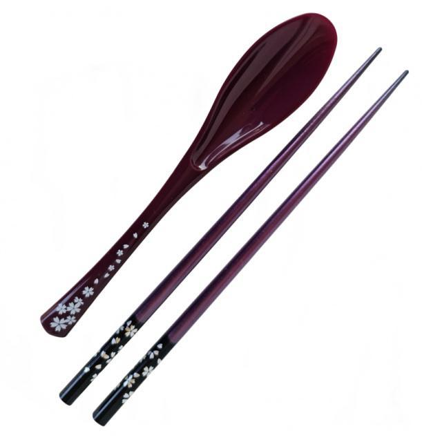 Sada Wakasanuri Purple se skládá z japonských jídelních hůlek a polévkové lžíce s motivem třešňových květů. Set obdržíte v elegantní dárkové krabičce.