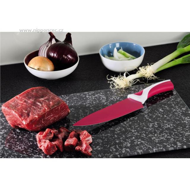 ukojeti nožů jsou ergonomicky tvarované pro bezpečné a pevné uchopení, vše v atraktivním červeno bílém provedení. Snadné čištění pod tekoucí vodou. Široký rozsah využití za výhodnou cenu.Velký nůž se širokou čepelí o celkové délce: 32 cm a délce čepele: 19,5 cm - použití na krájení masa, kořenové zeleniny.