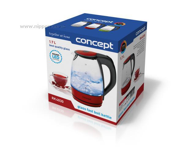 Spolehlivá, bezpečná a elegantní. Skleněná rychlovarná konvice Concept RK4030re o objemu 1,7 l rozzáří vaši kuchyň! A to doslova, protože díky LED diodám během provozu modře svítí. Také má dvojnásobnou bezpečnostní pojistku, optimálně tvarované ústí pro pohodlné nalévání vody do šálků a plně otočný podstavec, na který se dá postavit z jakéhokoliv úhlu.