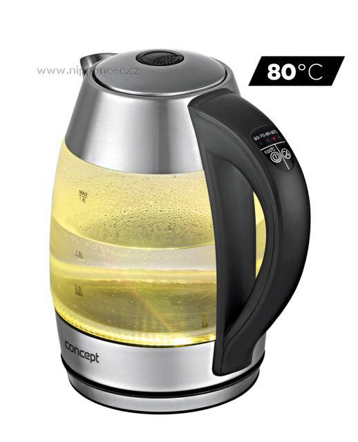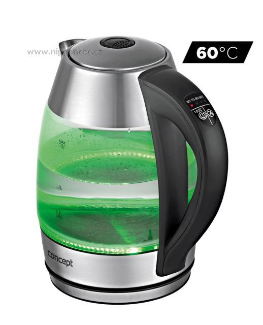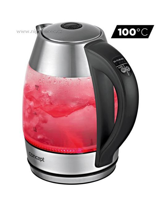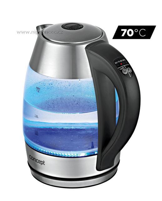 Skleněná rychlovarná konvice Concept RK4065 nabízí objem 1,8 l a možnost volby teplot od 60 do 100 °C. Disponuje trojnásobným bezpečnostním systémem, kvalitním konektorem a funkcí KEEP WARM pro udržení teploty vody. Konvice je vyrobená z velmi pevného, zdravotně nezávadného borosilikátového skla, které je odolné proti skvrnám. Jednou z největších předností konvice je celonerezové hrdlo, které zabezpečí větší odolnost při neopatrné manipulaci během plnění vodou. Tato čirá kráska a vodoznak vám zajití dokonalý přehled o tom, kolik vody právě vaříte. Hlavní předností konvice je funkce regulování teploty: můžete si vybrat 60°C, 70°C, 80°C, 90°C nebo 100°C. Konvice vás upozorní akustickým signálem, že je hotovo a voda je připravená na vámi zvolenou teplotu.