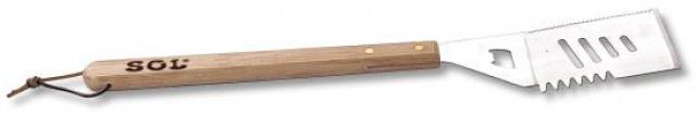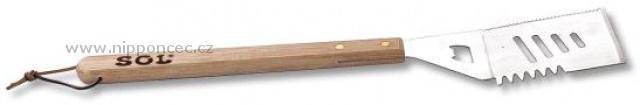 Díky důmyslnému tvaru obracečky maso snadno obrátíte, i když bude přichycené. Obracecí část je z nerezové oceli, rukojeť je dřevěná, což zajistí pevný úchop při manipulaci s masem či zeleninou. Jedna strana obracečky je vroubkovaná. Délka obracečky i s rukojetí je 49 cm.