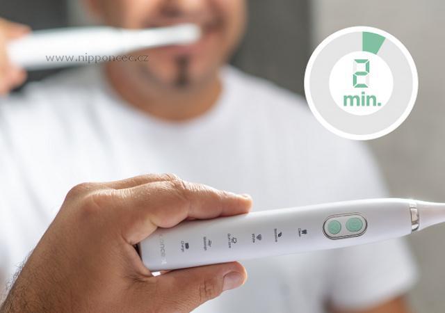 Dokonalý výsledek zajišťují ultrazvukové vibrace. Rychlost vibrací hlavice sonického zubního kartáčku je 38 000 kmitů za minutu a je tak optimální pro perfektní odstranění zubního plaku a pro ošetření dásní. Sonický kartáček pracuje v 5 režimech čištění. Režim CLEAN - používá se pro každodenní čištění a efektivní odstranění zubního plaku. Režim SENSITIVE je určen pro šetrné čištění citlivých zubů a dásní, režim WHITE se používá pro odstranění povrchových skvrn ze zubní skloviny a pro dosažení zářivého bílého úsměvu, GUM CARE pro účinné čištění dásní a MASSAGE pro jemnou masáž pomocí pulzujících vibrací.