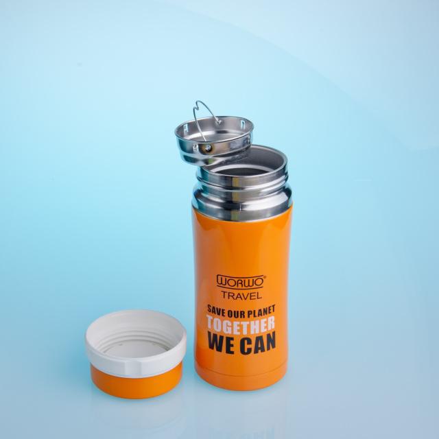 Cestovní šroubovací termoska na nápoje WORWO TFV-05 o objemu 450 ml. Termoska Worwo má vakuově izolované pouzdro se dvěma nerezovými stěnami premium 18/8. Vnitřní stěny termosky Worwo jsou pokoveny tenkou vrstvou mědi, která stejně jako stříbro má antibakteriální účinky. Díky tomu si nápoje v termosce dlouho udrží dobrou chuť a nepodlehnou tak snadno kvašení. Termoska je lehká, s kompaktními rozměry. Udrží nápoje teplé až po dobu 8 hodin a studené po dobu 24 hodin. Termoska Worwo má specielní síto na kávu či čaj ve výbavě - aby lístky, kávová sedlina v případě kávy turecké, apod. nestékaly při nalévání do hrnečku. Nelze mýt v myčce nádobí.