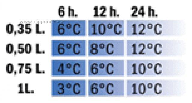 Modrá orientační tabulka znázorňuje účinnost termosky pro studený nápoj