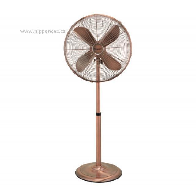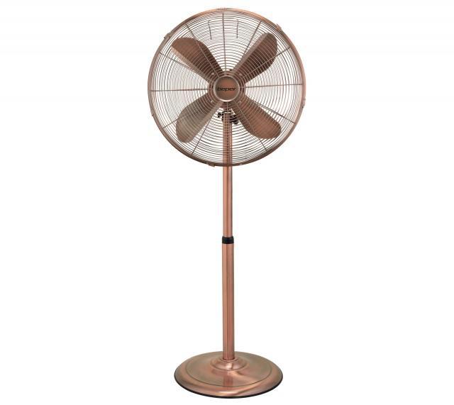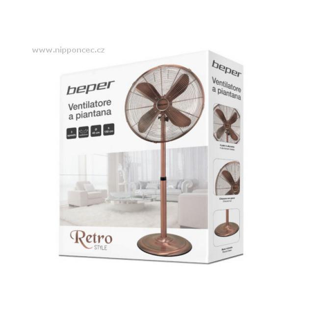 Stylový stojanový RETRO ventilátor BEPER VE111 s měděným designem. Vybaveno 4 hliníkovými lopatkami, které jsou chráněny mřížkou o průměru 45 cm. Můžete nastavit 3 rychlosti a 70° automatickou oscilační funkci pro stejnoměrné rozptýlení vzduchu. Výška 130 cm a protiskluzová kulatá základna pro zajištění maximální stability.
