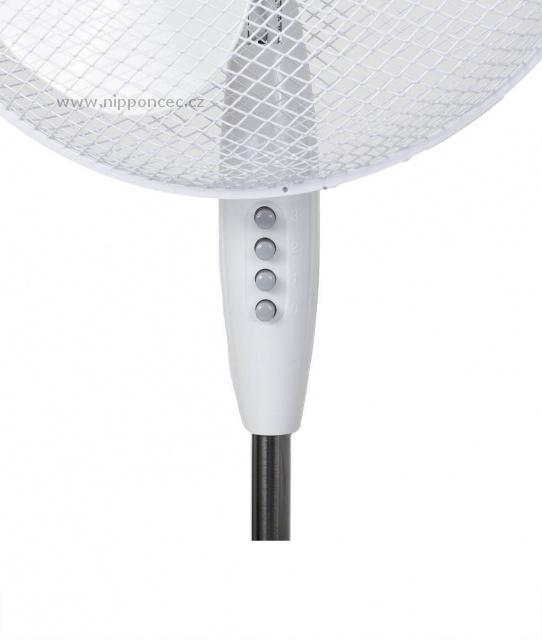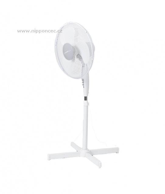 Energeticky úsporný stojanový ventilátor First Austria, v bílé barvě,  40 cm průměr, s ochrannou mřížkou, 3 stupně rychlosti,  otáčení nebo aretace, náklon. Výkon 50 W.