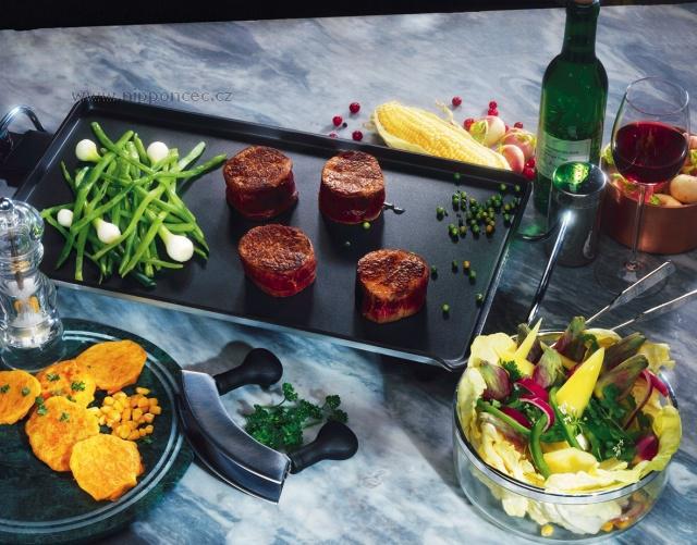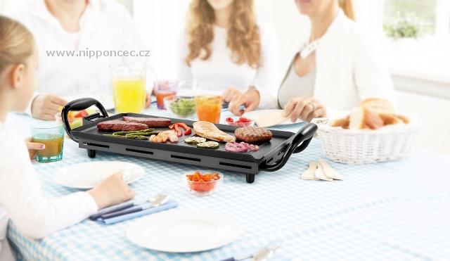 Vysoký výkon 1800W - u stolu nebudete dlouho čekat. Rukojeti stolního grilu zůstávají chladné pro bezpečnou obsluhu. Vzhledem k odnímatelnému kabelu s termostatem můžete grilované potraviny servírovat i přímo na stole. Gril je ideální pro přípravu masa, ryb, zeleniny, palačinek a mnoho dalších způsoby přípravy pokrmů, bez nutnosti přidání tuku pro zdravější vaření, které navíc dobře chutná. Gril lze použít i na barbecue. Vzhledem k použití velmi kvalitních materiálů je údržba grilu velmi jednoduchá, většinou jej stačí otřít ještě vlažný po použití pouze papírovou kuchyňskou utěrkou, ploténku grilu navíc můžete mýt i v myčce nádobí.