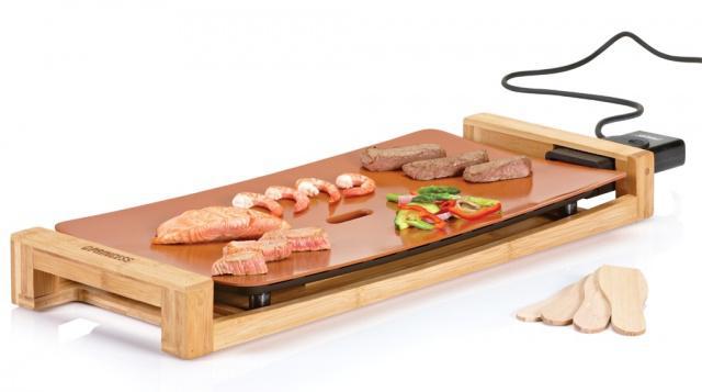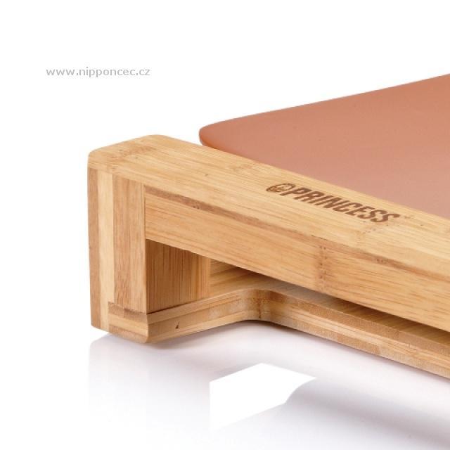 Stolní gril PRINCESS 10 3040 Pure Terra v designovém provedení v kombinaci z přírodního - bambusového dřeva a grilovací plotny s extra hladkou, keramickou grilovací deskou v terakotové barvě. Gril je vybaven odnímatelným plynule regulovatelným termostatem od 90ti do 210 stupňů Celsia se světelnou kontrolkou pro komfortní obsluhu a lze jej použít i k rozmrazování. Součástí balení je 6 dřevěných špachtliček.