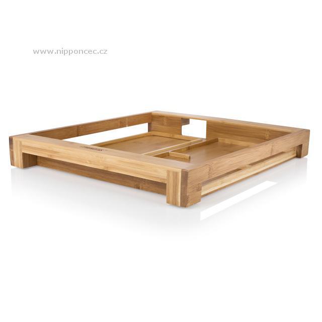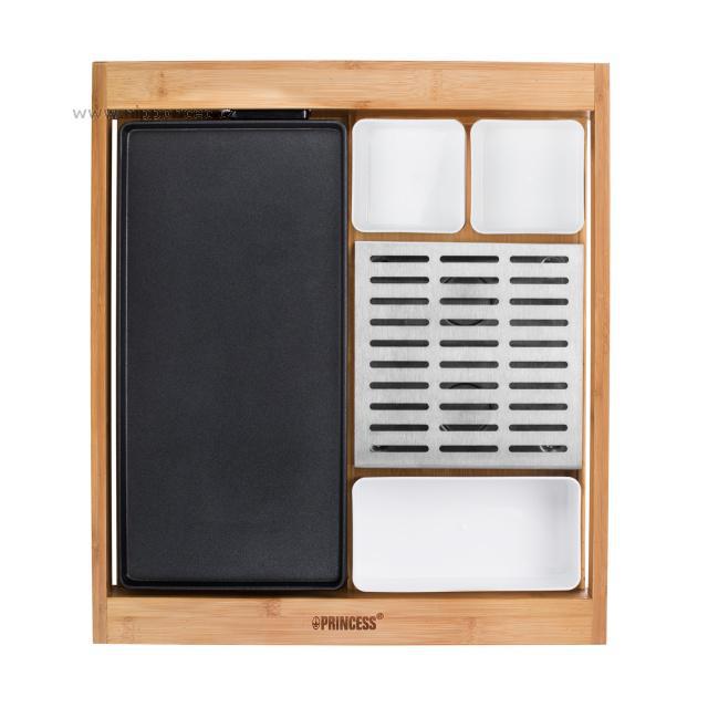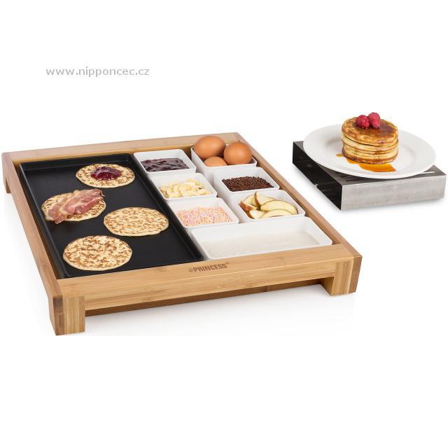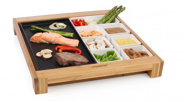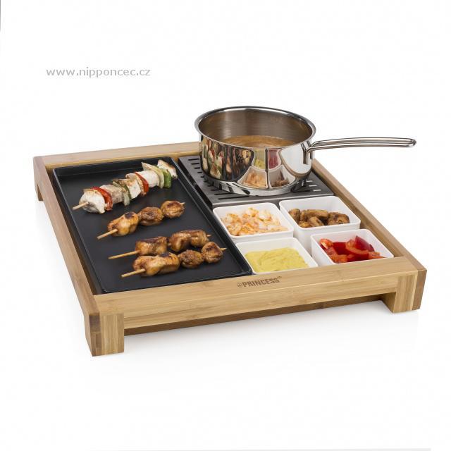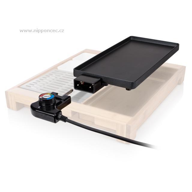 Multifunkční designový stolní gril v bambusovém rámu pro přípravu masa, zeleniny, palačinek, vajec apod. Pečící/plochá grilovací plocha, ohřívač, 3 různé misky, termostat na odnímatelném kabelu. Na nerezové desce na boku lze přihřívat čajník apod. Nepřilnavý povrch grilu pro snadné čištění a údržbu, světelná indikace provozu, 2 malé misky, 1 podlouhlá miska pro odkládání různých příloh, topinek apod. Výkon: 1500 W.