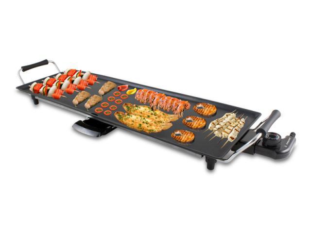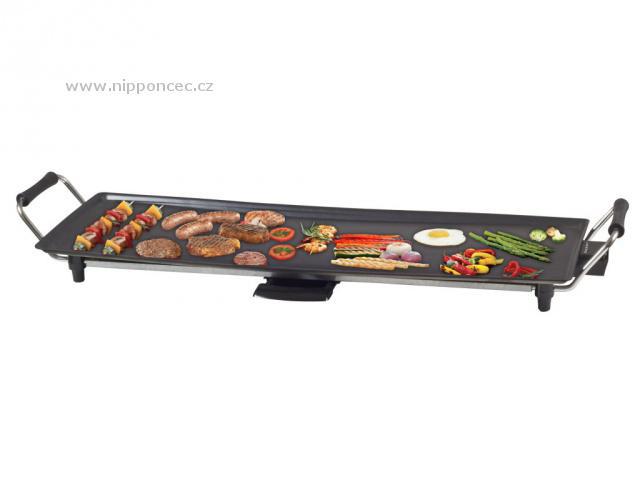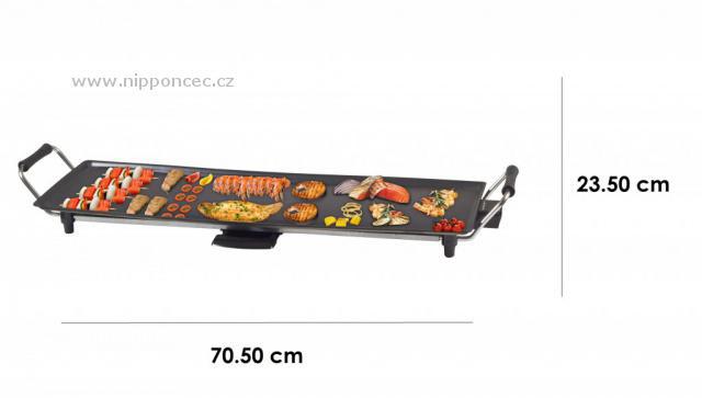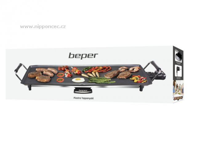 Velký teppanyaki gril BEPER 90386 s nepřilnavým povrchem a zásobníkem na odkapávající tuk je ideální pro servírování přímo na stole. Grilovací plocha 70,5 × 23,5 cm zajistí dostatek místa na grilování pro celou rodinu. Gril disponuje regulátorem pro nastavení teploty v pěti úrovních a integrovanou kontrolkou pro indikaci provozu.