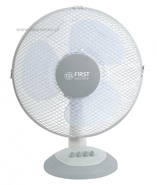 Stolní ventilátor First Austria, v bílé barvě. V horku ochladí, v zimě může rozptýlit teplý vzduch od topného tělesa po místnosti. Průměr 30 cm, s ochrannou mřížkou a dvěma rychlostmi. Vertikální otáčení, 40 W.