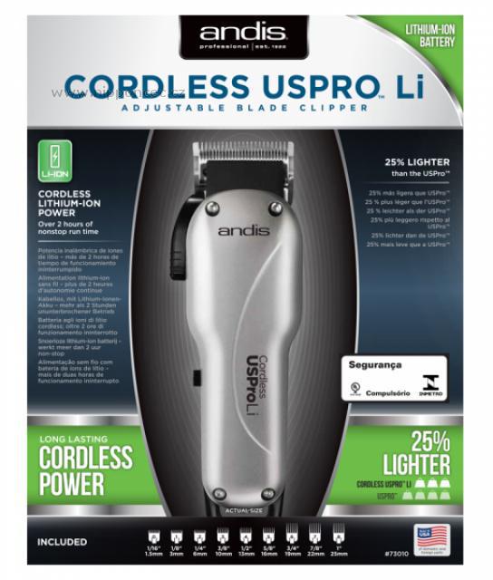 Americký střihací strojek Andis Cordless UsPro je vhodný pro profesionální střih suchých i mokrých vlasů. Provoz je možný jak s připojením k síti, tak i bezdrátově.Střihací hlavice, kterou je strojek osazen, je chromovaná a tudíž vysoce odolná. Navíc výška střihu hlavice je plynule a snadno nastavitelná a to od 0,5 do 2,4 mm. Po pouhém 90minutém dobíjení je možný 2 hodinový nepřetržitý provoz.