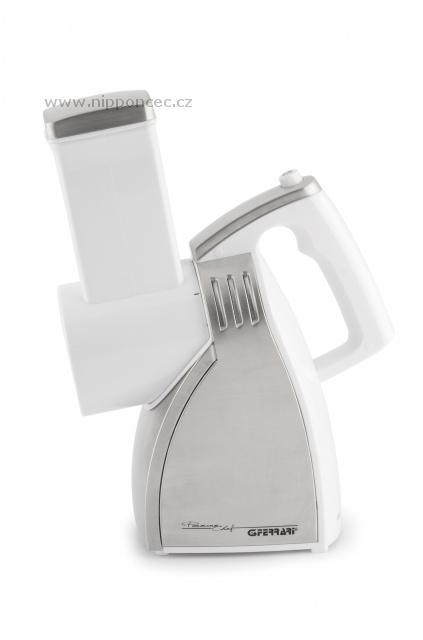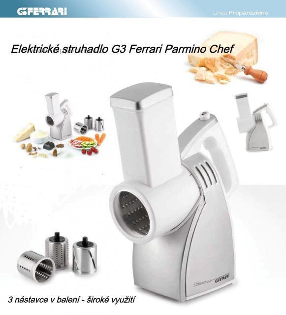 Elektrické struhadlo G3 Ferrari Parmino Chef je vysoce efektivní - např. 1/2 kg mrkve nakrouháte za cca 4 minuty, půl kila jablek za 4-5 minut. Můžete jej využít na strouhání sýra včetně – parmezánu, drcení ořechů nebo semínek, zeleniny i ovoce, tvrdého chleba či rozhlíků. Praktické držadlo umožňuje snadnou manipulaci. Součástí balení jsou 3 strouhací nástavce pro různé velikosti strouhání a krájení o průměru 75mm a přítlačný váleček. Plochý nástavec použijete na krájení koleček např. na oblíbený okurkový salát nebo na jablka na jablečný závin, nástavec s většími otvory pro mrkev, brambory, celer, jablka, hrušky, mango, avokádo, apod., malý nástavec je ideální na sýr a oříšky.