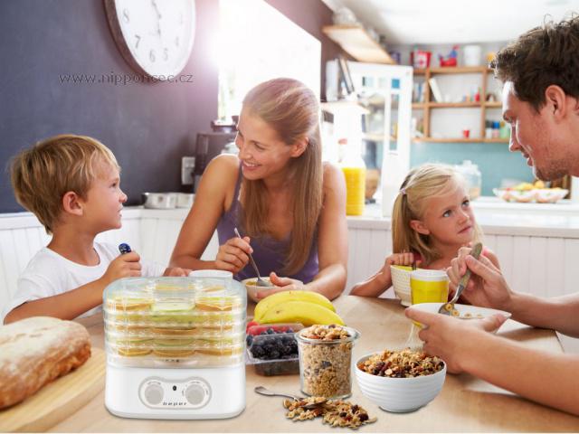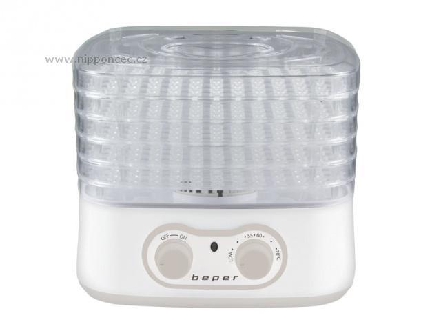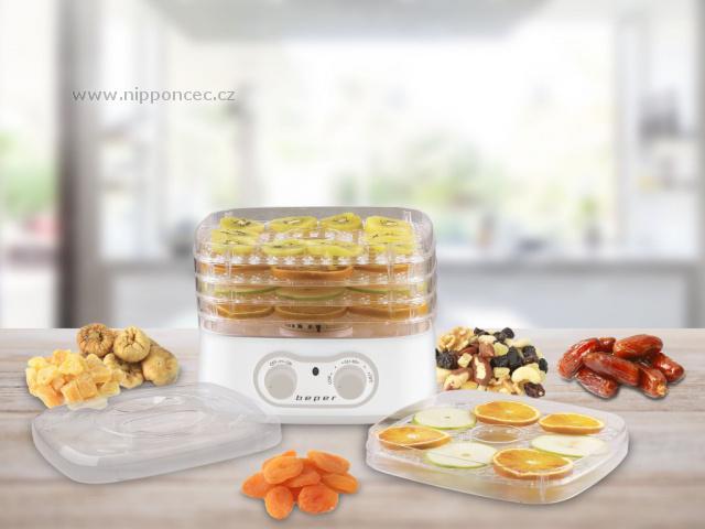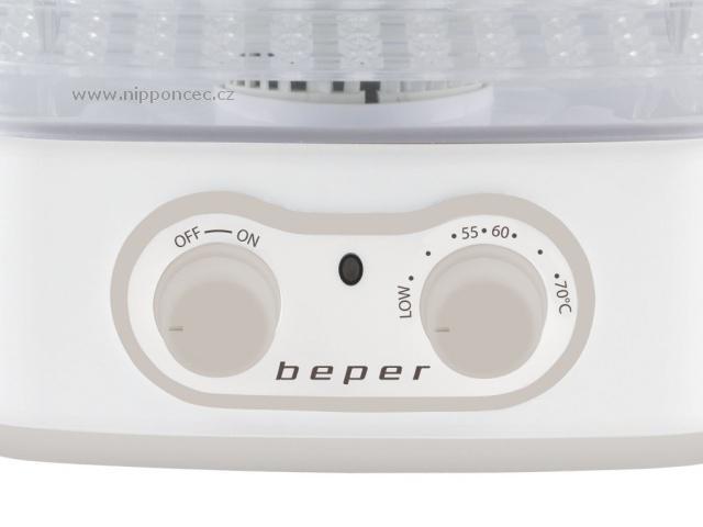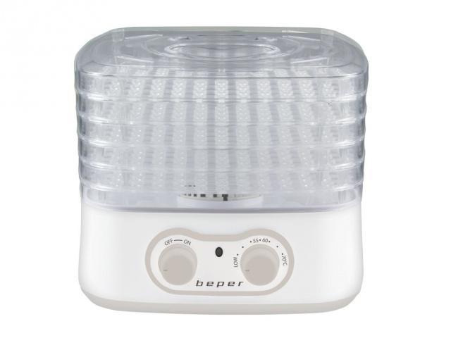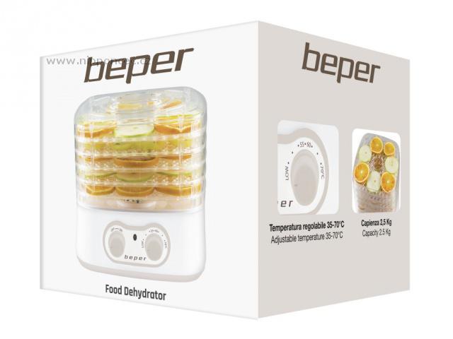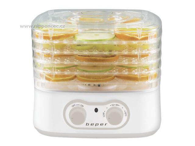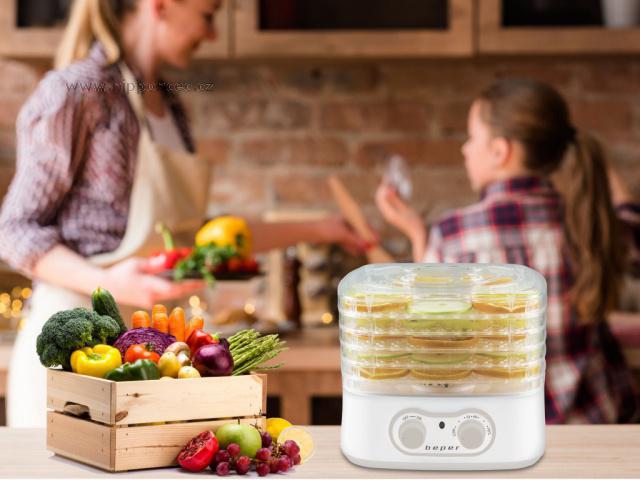 Sušička ovoce a zeleniny BEPER BC200 - 5 pater umožňuje nastavení sušících teplot v rozmezí 35 až 70°C. Integrovaný ventilátor zajistí zcela rovnoměrné sušení. Odnímatelné police o rozměrech 24 x 24 cm, každá s kapacitou 500 g. Sušící stojany je možné mýt v myčce nádobí. Jednoduše si připravíte sušenou zeleninu, ovoce, houby do polévky, zdravé křížaly z jablek, švestek nebo hrušek. Kapacita 2,5 kg.