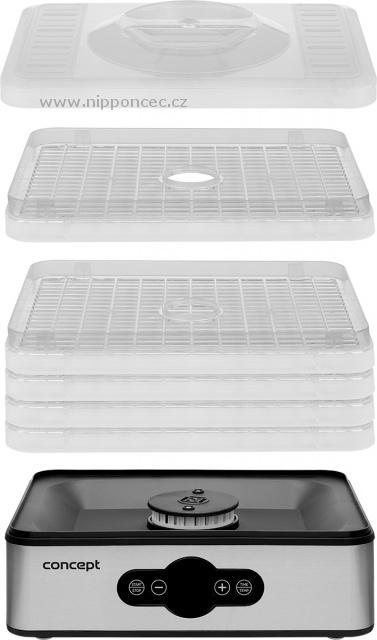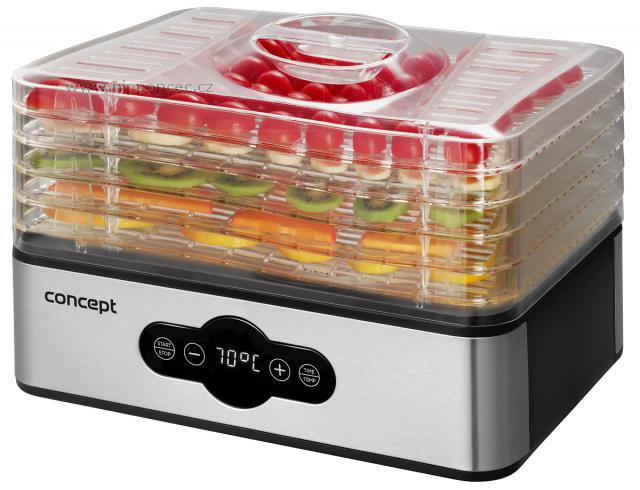 Sušička ovoce a zeleniny Concept SO2080 s příkonem 260 W disponuje 6 výškově nastavitelnými platy, regulací teploty od 35 – 70°C, časovačem a ventilátorem pro rovnoměrné sušení.