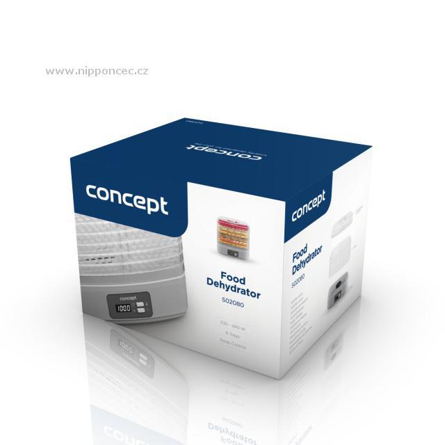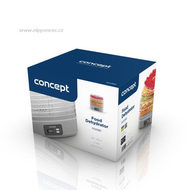 Sušička ovoce a zeleniny Concept SO2080 s výkonem 260 W disponuje 6 výškově nastavitelnými platy, regulací teploty od 35 - 70°C, časovačem a ventilátorem pro rovnoměrné sušení. Díky svému hranatému tvaru je velmi skladná. Obdélníková plata lze mýt v myčce na nádobí. Na výběr ze dvou výšek plat - možno sušit i objemnější potraviny. Vhodná pro každodenní využití.                                      Sušička ovoce a zeleniny Concept SO2080 s výkonem 260 W disponuje 6 výškově nastavitelnými platy,
