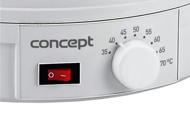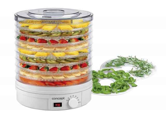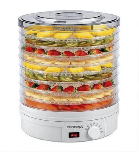 Sušička ovoce a zeleniny Concept SO2080 s příkonem 260 W disponuje 6 výškově nastavitelnými platy, regulací teploty od 35 – 70°C, časovačem a ventilátorem pro rovnoměrné sušení.