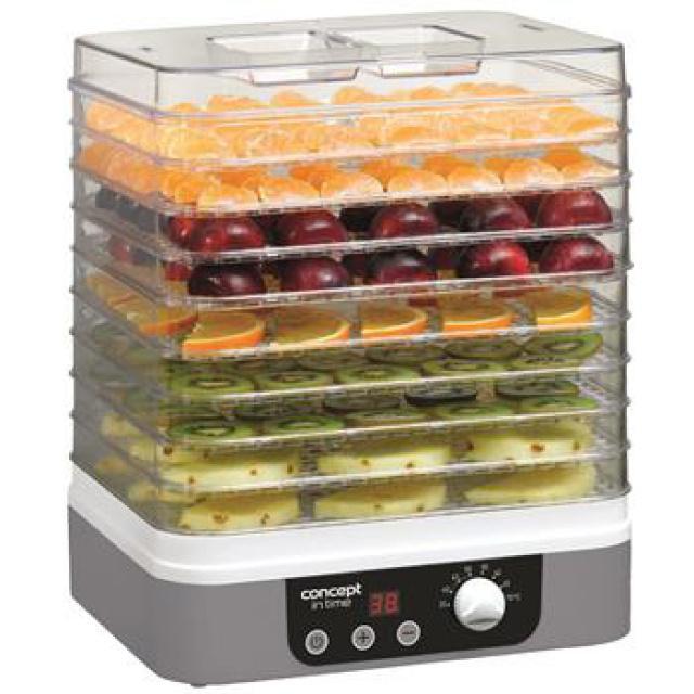 Sušička ovoce a zeleniny Concept SO2080 s příkonem 260 W disponuje 6 výškově nastavitelnými platy, regulací teploty od 35 – 70°C, časovačem a ventilátorem pro rovnoměrné sušení.
