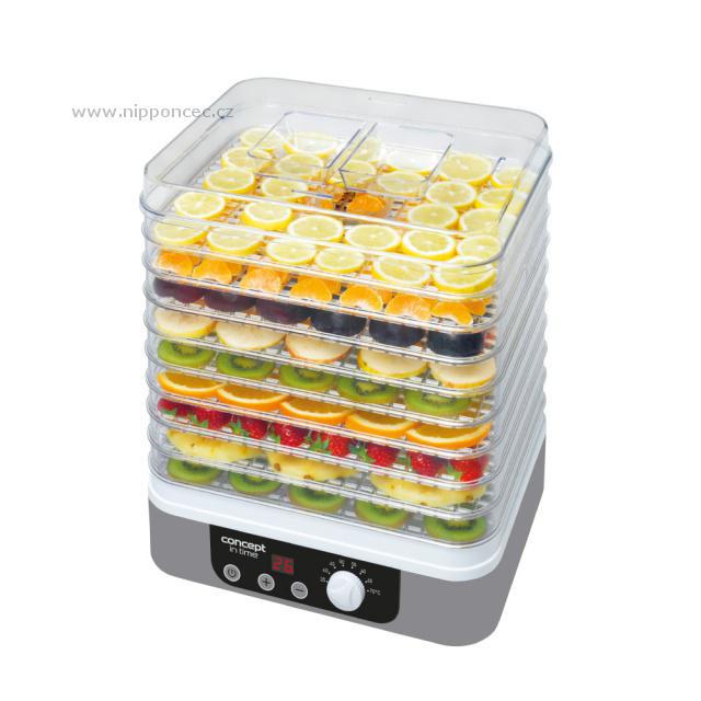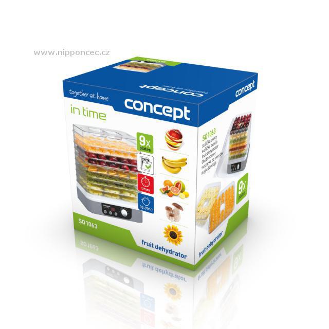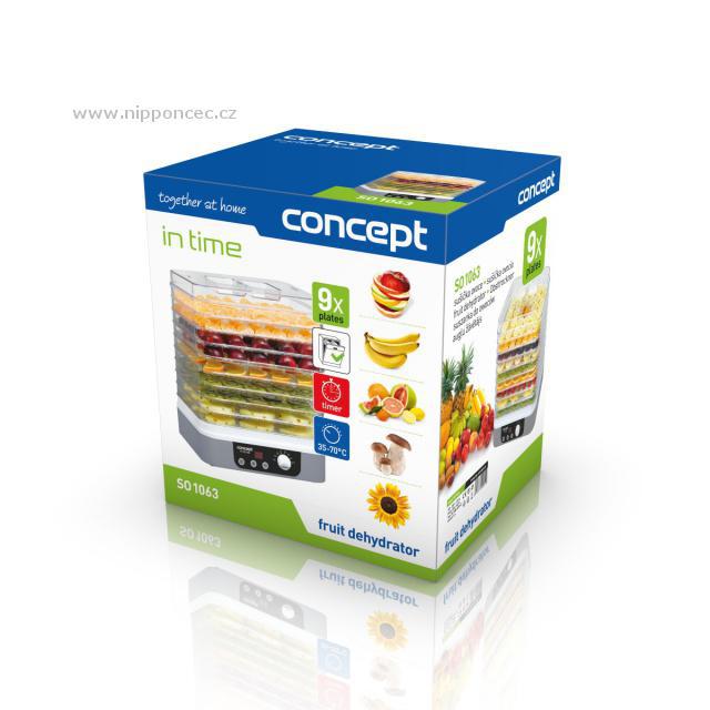 Sušička ovoce a zeleniny Concept SO1060 s časovačem a plynulou regulací teploty je vybavena 9 sušicími platy a ventilátorem pro rovnoměrné sušení ve všech patrech. Díky praktickému hranatému tvaru je velmi skladná a šetří místo v kuchyni.