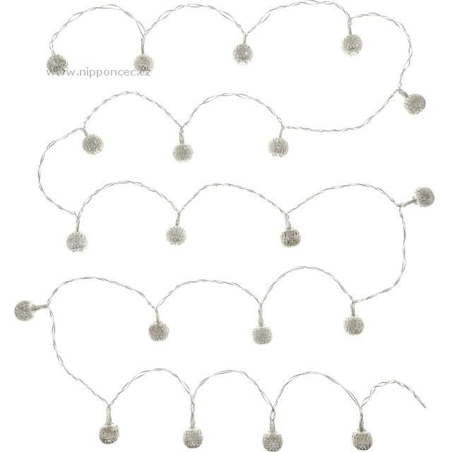 Světelný řetěz se stříbrnými kuličkami je krásná dekorace, která navodí příjemnou atmosféru ve vašem domově během Vánoc i celého roku. Řetěz je napájen bateriemi, tudíž nejste limitováni zásuvkami. Produkt je určen pouze pro použití v interiéru.