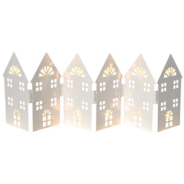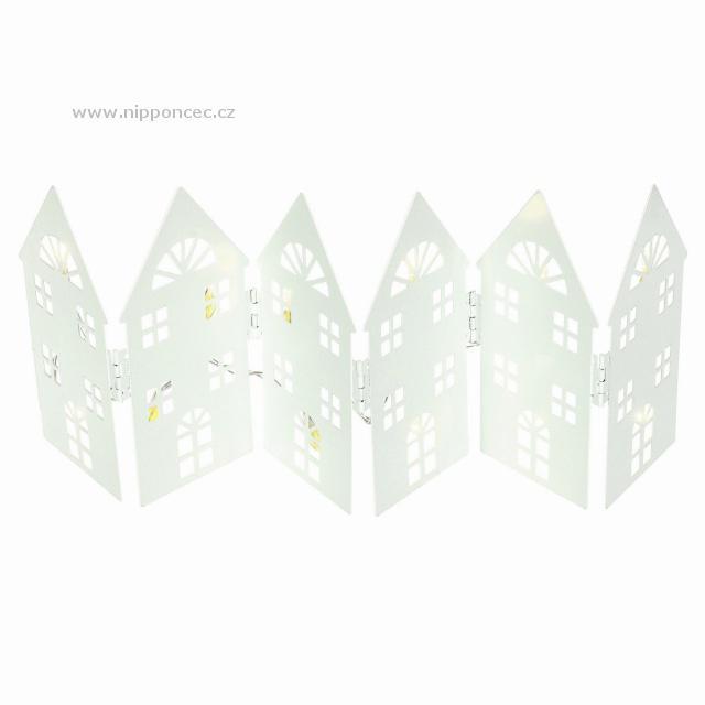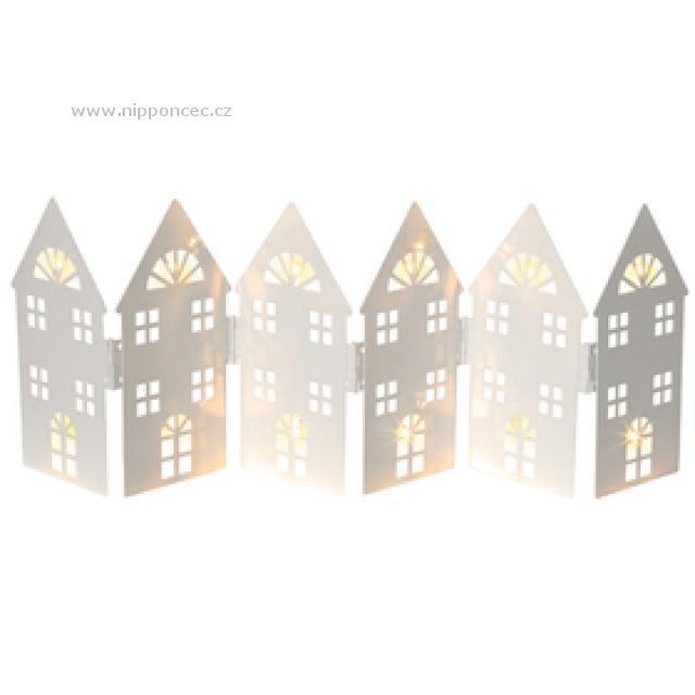 Svítící vánoční dekorace v podobě 6 kovových domečků navodí příjemnou vánoční atmosféru ve vašem domově. Výška dekorace 14 cm, délka 44 cm. Barva bílá. 12 Led