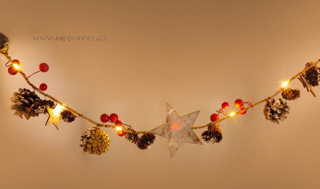 Svítící vánoční girlanda s přírodní dekorací v odstínu hnědé a červené navodí příjemnou vánoční atmosféru ve vašem domově. Girlanda o délce 2,5 m je napájen 3 AA bateriemi, tudíž nejste limitováni zásuvkami.
