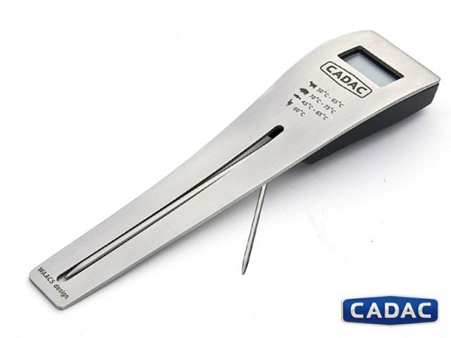 Digitální elektronický teploměr k dokonalé přípravě ryb, kuřete nebo masa. Pomocí sondy snadno, rychle a přesně změří teplotu uvnitř masa. Sonda je výklopná a při skladování zůstává krytá a chráněná, vyklápí se pouze při měření teploty. Cadac teploměr je vybaven magnetem, který umožňuje jeho odložení na jakýkoliv kovový povrch.