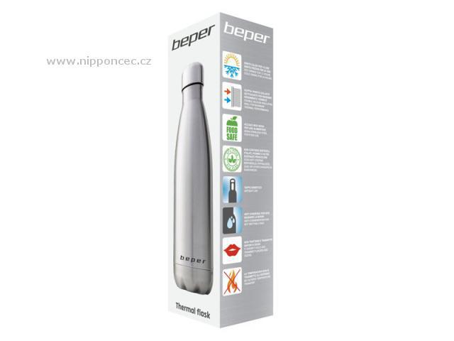 Lehká a kompaktní termo lahev BEPER BI505 má dvojitou izolační stěnu z nerezové oceli a antipachovou a antikondenzační úpravu, je vhodná pro uchování horkého i studeného nápoje. Teplé nápoje nevystydnou díky této termosce až 12 hodin, studené budou mít svoji teplotu až 24 hodin. Lahev vám umožní dopřát si teplý či studený nápoj nejen doma, ale i na výletě, při sportu nebo při cestě do zaměstnání. Díky svému tvaru se snadno vejde do každého zavazadla a vzduchotěsný uzávěr zajistí bezpečnou přepravu nápoje. Pojme až 0,5 litru tekutiny.