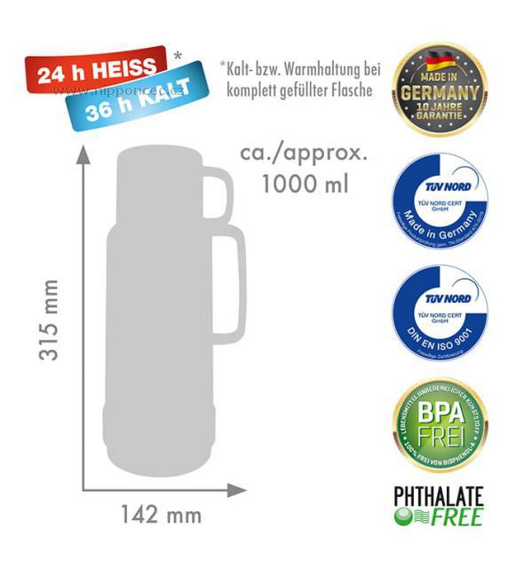 Kvalitní termoska s plastovým krytem a skleněnou vložkou od německého výrobce Rotpunkt. Šroubovací uzávěr lze odšroubovat lehkým pohybem. Pro nalití nápoje z termosky stačí uvolnit uzávěr pouze zčásti - snadné nalévání. Při zcela naplněné láhvi uchová teplotu nápoje cca 12 hodin. Součástí je hrneček na vrchní části.