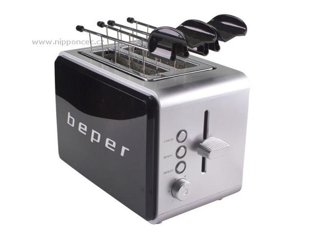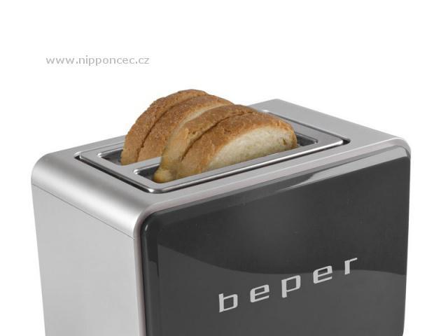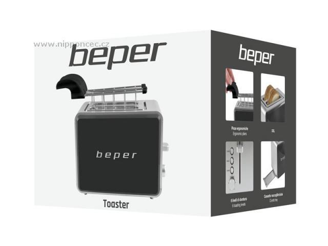 Topinkovač BEPER BT001-N s výkonem 750 W disponuje funkci rozmrazování a opětovného ohřevu. Pokud budete chtít již hotovou topinku ohřát, stačí zvolit možnost opětovného ohřevu. Nastavení 6 stupňů intenzity opečení. Topinkovač je pro 2 kusy topinek o tloušťce až 3,5 cm. Spadané drobky se zachytávají do nádoby, kterou lze vyjmout a lehce vysypat.