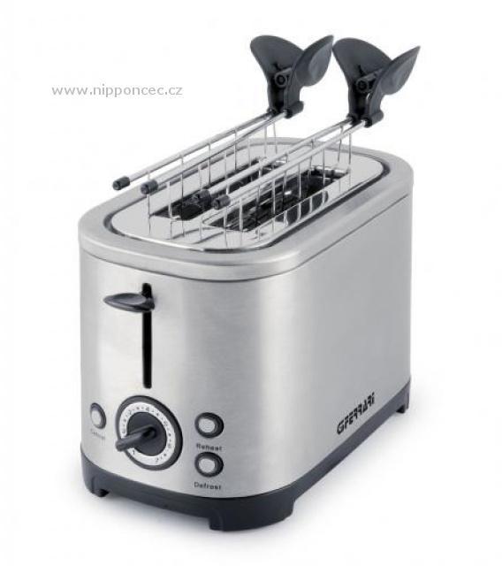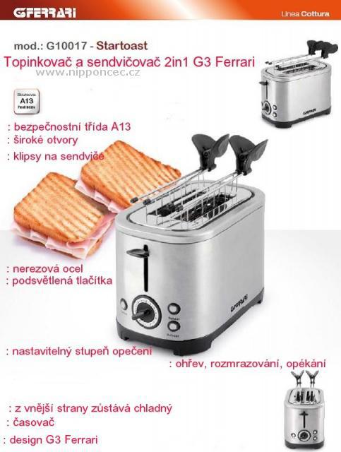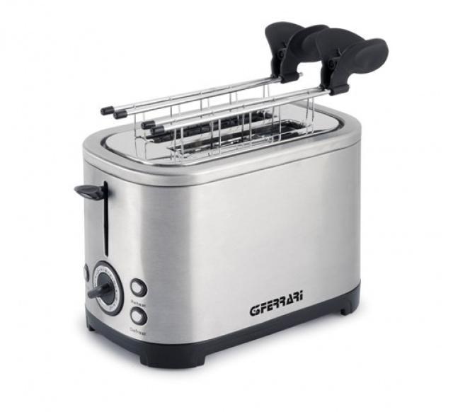 Topinkovač G3 Ferrari Startoast má široké dvě štěrbiny, součástí balení jsou dvě klipsy na plněné sendviče. Je vybaven automatickým centrovacím mechanismem pro rovnoměrné opečení topinek a vysokým vysunutím pečiva - topinky lze snadno vyjmout a LED světelnou kontrolkou pro komfortní obsluhu. Stěny topinkovače jsou izolované, dvojité, aby nebyl při použití povrch topinkovače příliš horký. Design je vkusný, provedení velmi solidní - pokud topinky připravujete často, zcela jistě jej oceníte.
