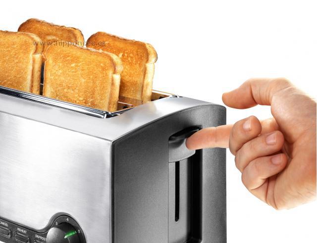 Topinkovač v atraktivním designu, z broušené nerezové oceli, vhodný na opečení čtyřech topinek najednou - nebo samozřejmě místo 4 klasických toastů, můžete použít rozpůlenou velkou bagetu, nebo bagetu střední, rozkrojenou na polovinu. Topinkovač Petra je vybavený teplotním senzorem, regulátorem stupně opečení a automatickým centrovacím mechanismem pro optimální propečení pečiva.