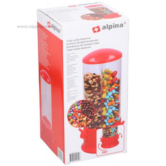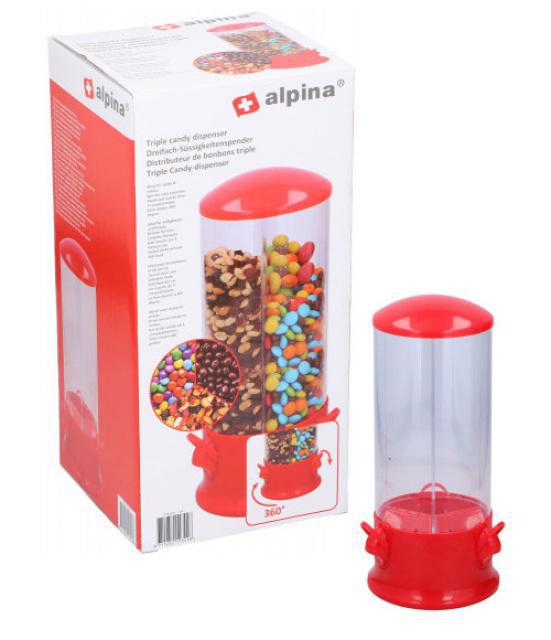 Třídílný dávkovač na cukrovinky Alpina 11341 pro snadné dávkování až 3 sladkostí nebo cereálií. Zásobník lze naplnit sladkostmi, ořechy, rozinkami nebo cereáliemi. Dávkovací mechanismus, který jedním otočením porcuje pochutiny do předem připravené misky. Dávkovač je vhodný pro použití s potravinami. Základna se otáčí o 360 stupňů.