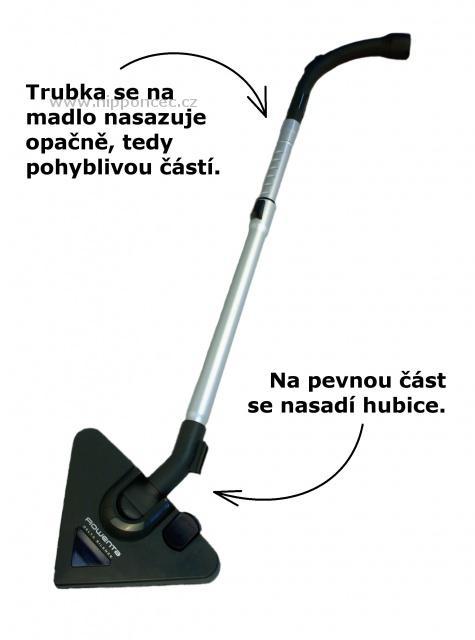 • Upozornění: trubka se vkládá obráceně, než je obvyklé. Do vysouvací teleskopické části se vsouvá madlo vysavače 32mm, pevná část se vsune do hubice.