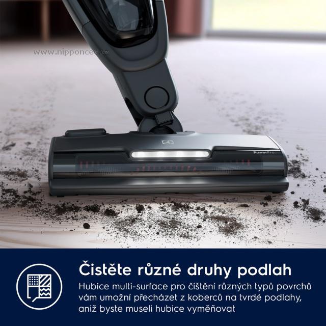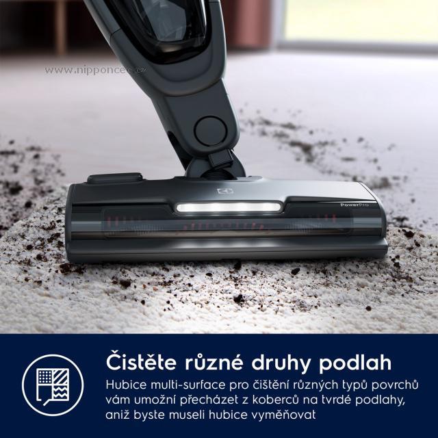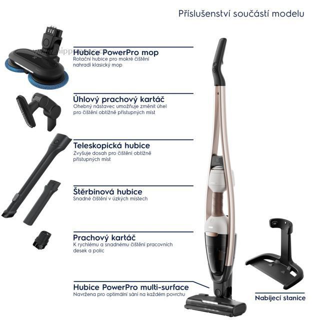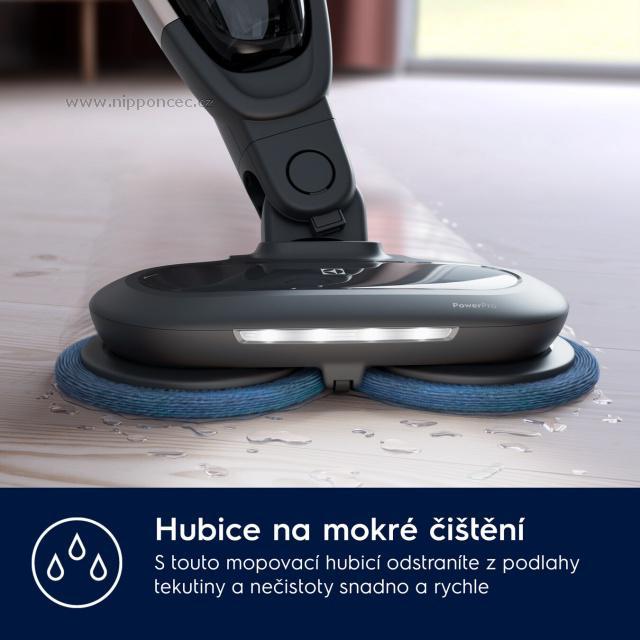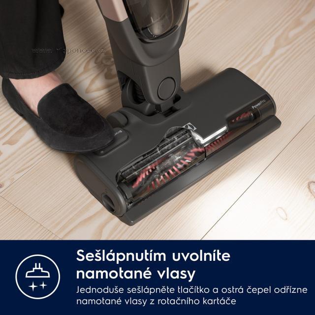 Výkonnější a tišší tyčový AKU vysavač Electrolux 600 ES62P25WET pro snadný úklid celé domácnosti. Vysavač s motorizovanou hubicí, která při vysávání produkuje až o polovinu méně hluku. PowerPro multi-surface pro všechny typy povrchů vám umožní plynule přecházet z koberců na tvrdé podlahy. Hubice PowerPro mop efektivně odstraní tekutiny a odolnou špínu z tvrdých podlah díky rotačním podložkám. S osvětlením LED DustSpotterTM na hubici snadno objevíte i ty nejmenší drobky. Technologie BrushRollCleanTM zajistí snadné odstranění vlasů a vláken, které uvíznou na kartáči. Díky této jedinečné funkci můžete kartáč vyčistit pouhým sešlápnutím pedálu na hubici.