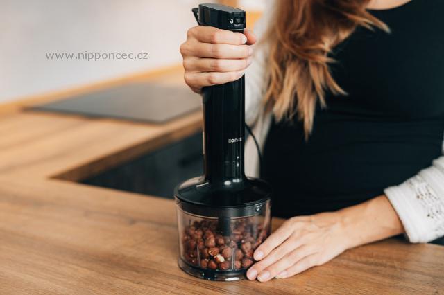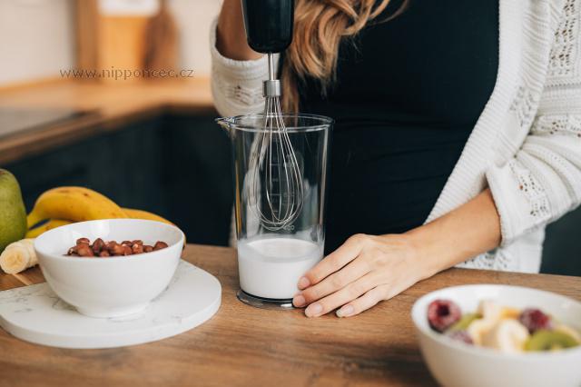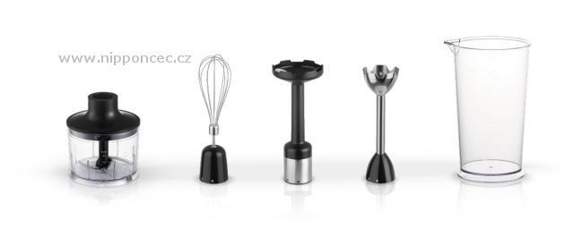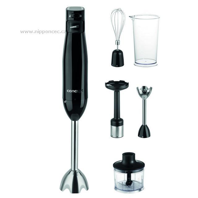 Plynulá regulace rychlosti, chopper o objemu 500 ml, mixuje horké i studené.   Tyčový mixér Concept TM5020 s chopperem, šlehací metlou, mixovací nádobou a nástavcem na pyré, 1000 W
