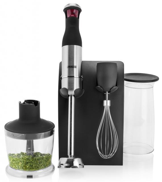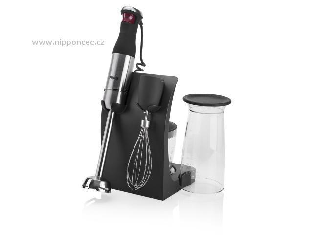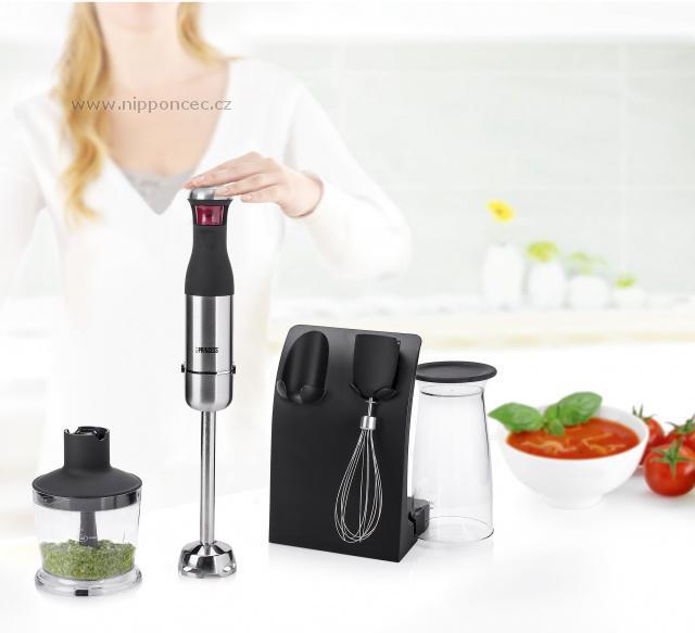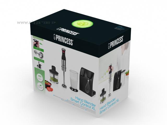 Tyčový mixér Princess Blender Smart Control XL s příkonem 800W, širokým příslušenstvím a praktickým stojanem, v praktické i hezké kombinace černé barvy s nerezovou ocelí. Kompaktní a výkonný s unikátní technologií ovládání rychlosti pomocí tlaku vašeho ukazováčku na ovládací tlačítko. Čím silněji stisknete, tím větší rychlost dostanete. Velmi jednoduché a intuitivní ovládání JEDNOU rukou. Součástí drtič, metla, stojan. Extra dlouhá sekací tyč 23 cm.