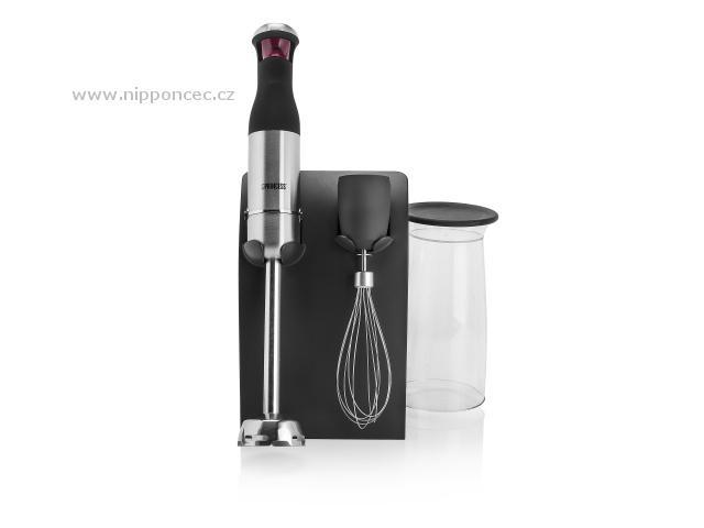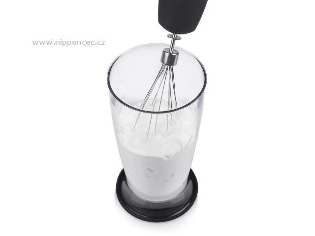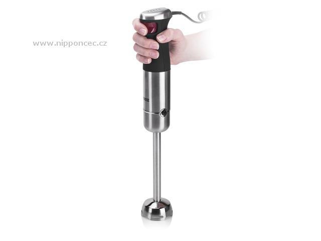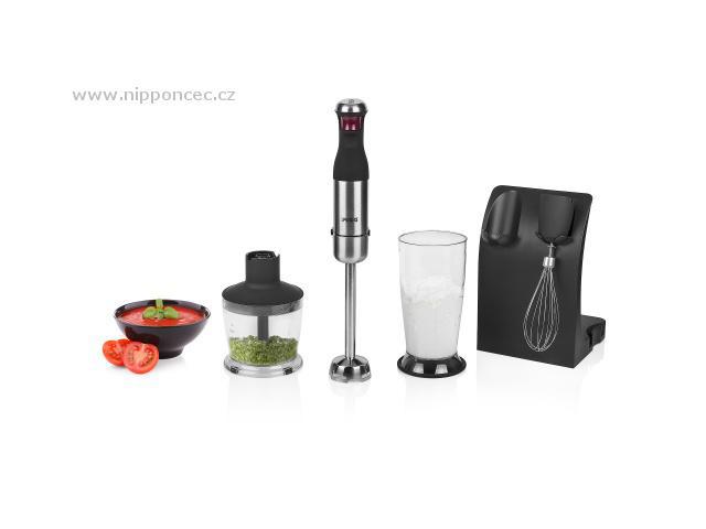 Rukojeť mixeru je ergonomická, dobře se drží. Díky jedinečnému ovladači rychlosti jej budete snadno ovládat jednou rukou. Využijete jej v každé kuchyni pro přípravu kaší, polévek, masa vařeného i syrového, zeleniny, drcení,krájení i strouhání aj. Součástí balení je praktický sekáček, například na pomazánky nebo kojeneckou stravu, nádobka na mixování s kapacitou 0,8 litru, šlehací metla z nerezové oceli a elegatní stojan v černé barvě, kam můžete mixér umístit, použiváte-li jej velmi často a chcete jej mít na kuchyňské lince stále po ruce. Výhodou mixéru je tichý chod. S tímto tyčovým mixérem připravíte např. kojeneckou výživu za pouhých 40 vteřin. Sekací tyč je dlouhá 23 cm.