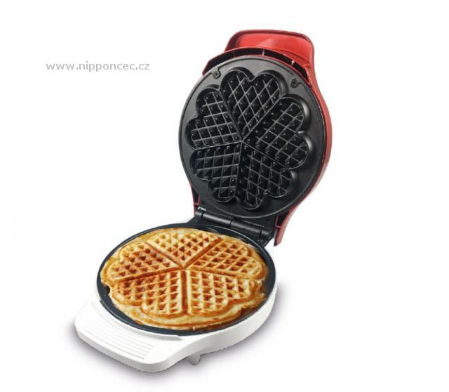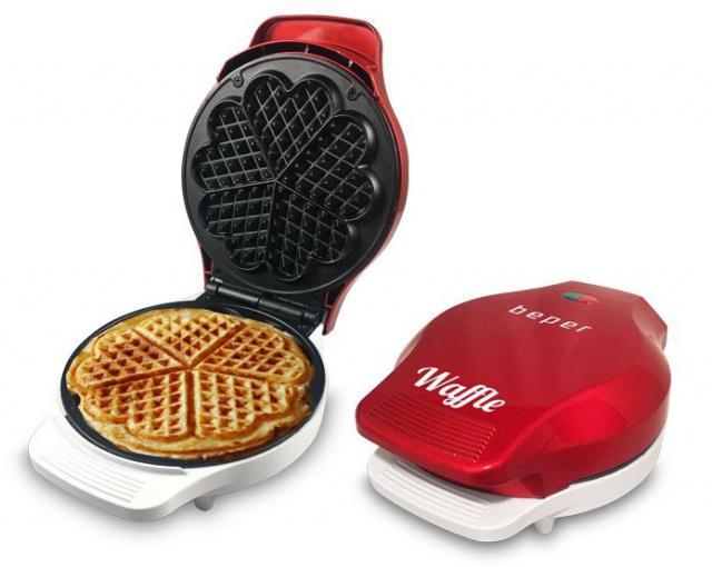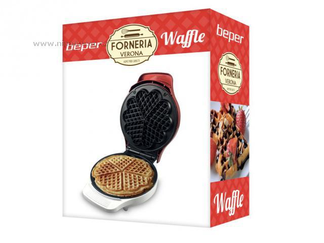 Vaflovač Beper Waffle je určen pro přípravu 5 vaflí ve tvaru srdce najednou. Celkový průměr je 18 cm, nepřipékavé pečicí ploténky usnadní čistění. Přístroje je vybaven dvěma světelnými kontrolkami - indikátorem provozu - červená kontrolka a indikátorem nahřátí (připravenosti k pečení) - zelená kontrolka. Doba přípravy jedné várky vaflí je cca 5-6 minut. Vaflovač disponuje nastavitelným termostatem, umožňujícím teplotu desek uzpůsobit dle druhu použitého těsta.