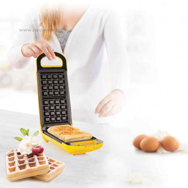 Vaflovač Princess 132406 Flip vám připraví 2 křupavé vafle za pár okamžiků. Ideální svačina, snídaně či pohoštění pro všední i sváteční den. Ve veselé žluté barvě. Vaflovač má ploténky potaženy nepřipékavou vrstvou na bázi teflonu pro snadné čištění vaflovače. Díky příkonu 700 W se přístroj velmi rychle nahřeje. Pro optimální rozložení tělesa je přístroj otočný o 180°. Vaflovač disponuje bezpečnostní pojistkou proti přehřátí, izolovanou rukojetí, světelnou kontrolkou (která upozorní na připravenost vaflovače) a žáruvzdorné pouzdro činí z tohoto výrobku praktického pomocníka do každé kuchyně.