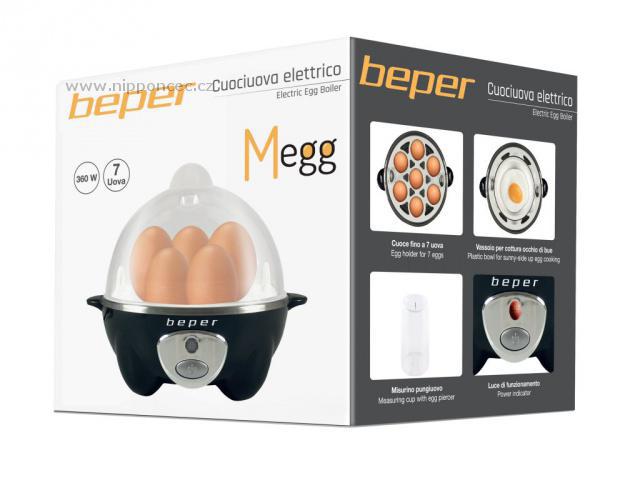 Vařič vajec BEPER na 7 vajíček s výkonem 360 W disponuje odnímatelným plastovým držákem vajec. Automatické vypnutí s akustickým signálem. Jednoduchá obsluha: do nádoby přidejte vodu podle požadované úrovně vaření, vložte perforovaná vejce, zakryjte a zapněte.