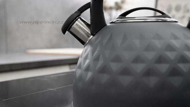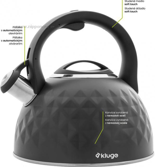 Konvice na vaření vody Kluge Diamante o objemu 2,5 litru je vhodná pro všechny typy sporáků včetně indukčních. Je vyrobena z vysoce kvalitní nerezové oceli, které vděčí za svou vynikající odolnost. Povrch konvice je v elegantní diamantové textuře v šedé barvě. Konvice je vybavena bezpečným madlem Soft Touch, které se nezahřívá. Píšťalka s automatickým otevíráním zaručuje pohodlné používání a ochranu proti popálení.