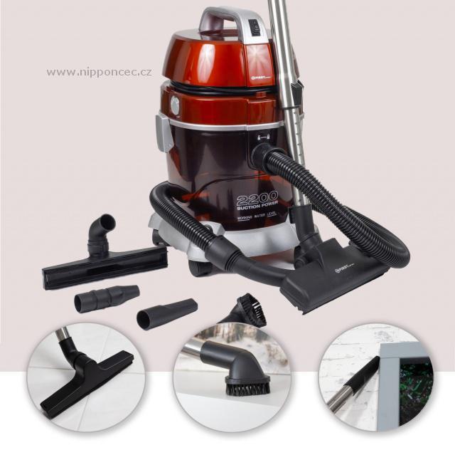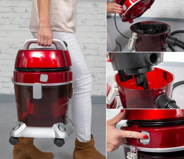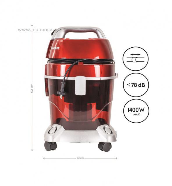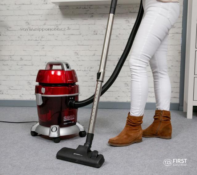 First Austria FA 5546-3-RE je víceúčelový bezsáčkový vysavač pro suché i mokré vysávání s kombinovanou hubicí vhodnou k luxování koberců i tvrdých podlah. Vysavač je vybaven vodním filtrem, který zajišťuje stálý sací výkon a kvalitnější vzduch bez alergenů. O dostatečný akční rádius pro pohodlný úklid se postará 5 metrů dlouhý přívodní kabel, teleskopická trubka a 1,5 metrů dlouhá hadice. Součástí vysavače je bohaté příslušenství - štěrbinová hubice, hubice na čalounění, lamelový kartáč a foukací nástavec. Nádoba na prach z transparentního plastu pojme až 6 litrů nečistot. Vysavač je vybaven užitečnou funkcí foukání např. pro odstranění listí z příjezdové cesty.