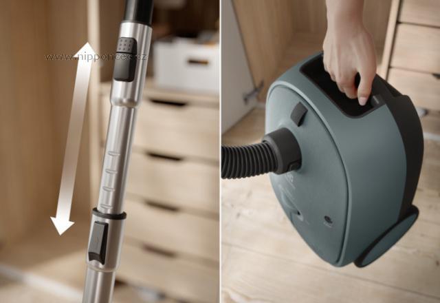 Akční rádius až 12 metrů a snadno se otáčející kolečka pro hladké a plynulé vysávání. Madlo zapuštěné v čele vysavače pro snadné přenášení.