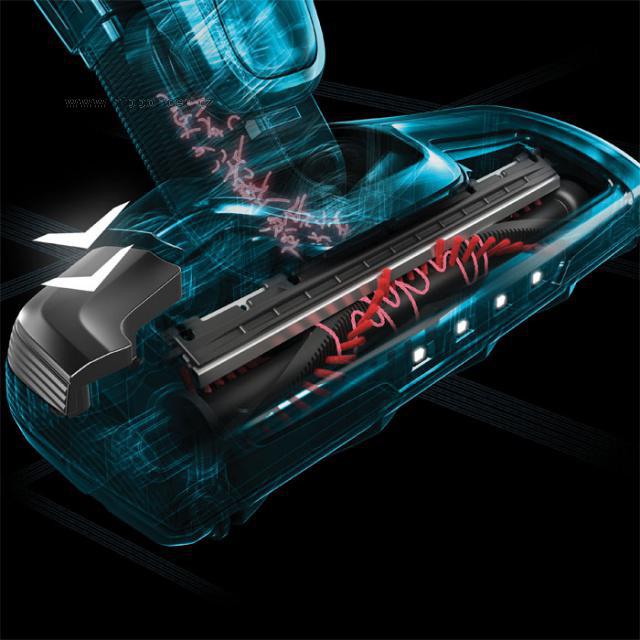 Patentovaná technologie Brush roll CLean (BRC) navíc umožňuje samočistící funkci pro vyčištění kartáče. Vysoký výkon zajišťuje cyklónová jednotka, která je složena z výkonného ventilátoru motoru a o 50% většího skládaného filtru s dvojitou filtrací. Nečistoty se zachycují v nádobě o objemu 0,5 litru a pro přehledné uklízení je podlahová hubice vybavená integrovanými LED diodami. S nimi odhalíte i ty nejmenší a nejskrytější drobky.